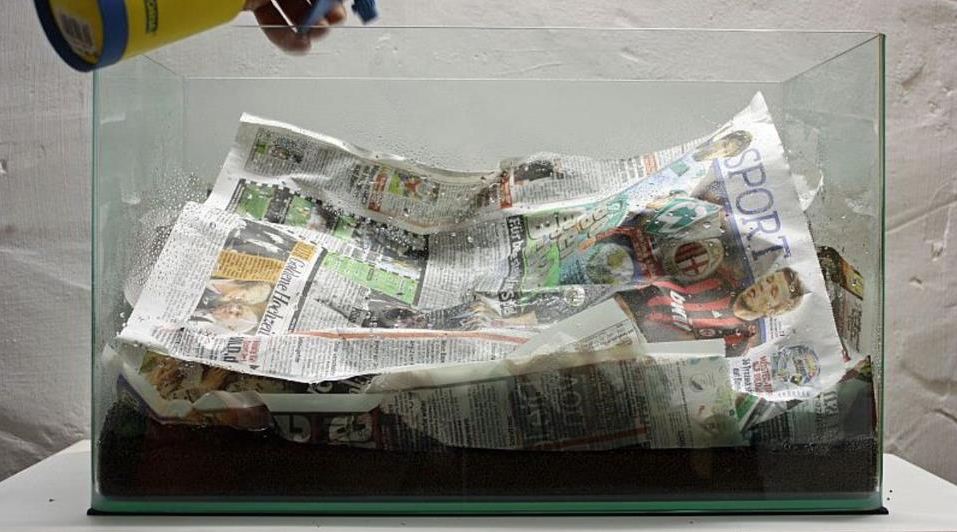 Setelah selesai kita menanam, sebelum kita memasukan air, masukan terlebih dahulu koran bekas sebagai penahan agar layout yang sudah kita buat tidak berubah saat kita masukan air. kalau tidak ada koran bisa juga menggunakan media penahan lainnya seperti plastik dll yang intinya bisa menahan air agar tidak merusak setup yang telah dilakukan sebelumnya.