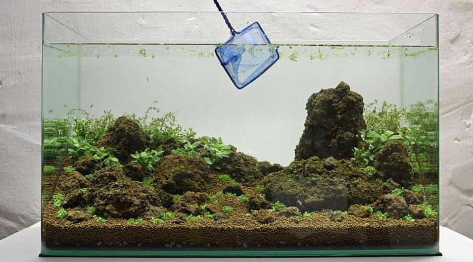 Bersihkan kotoran yang mengambang di atas, biasanya setelah kita melakukan setup ada beberapa daun yang patah akibat packing atau patah ketika proses tanaman dan juga kotoran dari media lain, seperti batu kayu atau pasir (yang sudah pernah dipakai sebelumnya). atau ada juga tanaman yang mengapung ini karena waktu menanam tidak cukup kuat memasukan akarnya ke soil / pasir. bersihkan saja!