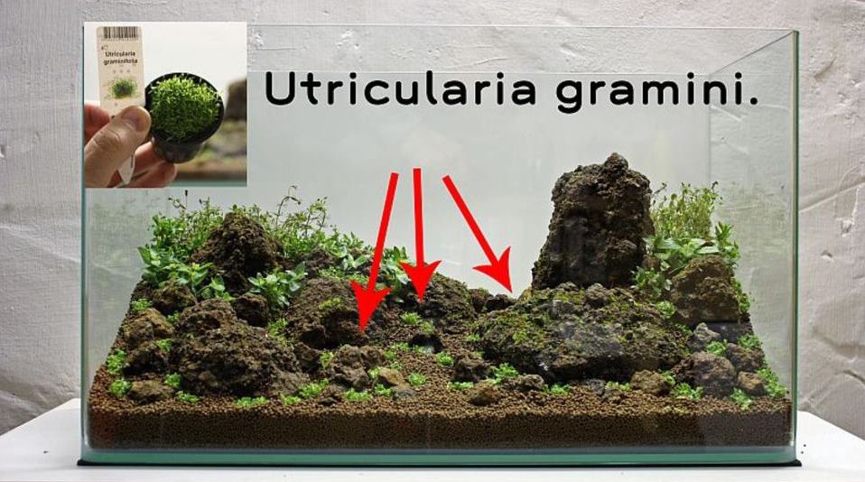 Jika posisi hardscape sudah pas, berarti ini saatnya kita untuk memasukan tanaman. Usahakan tanaman yang tumbuhnya rendah ditanam didepan dan tanaman yang tumbuhnya tinggi disimpan dibelakang. Jika belum tau masing-masing karakter tanaman bisa ditanyakan ke penjualannya. atau bisa gunakan mesin pencari google sebagai referensi. Tanaman yang digunakan setup kali ini adalah Hemianthus “cuba”, Staurogyne SP, Ultricularia Gramini “UG”, Rotala Rotundifolia. untuk penempatannya bisa dilihat digambar dibawah ini :